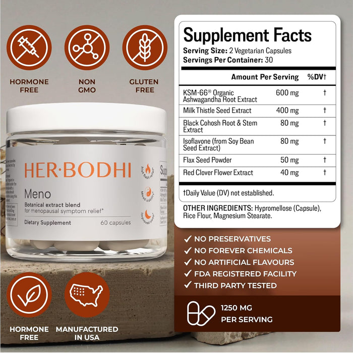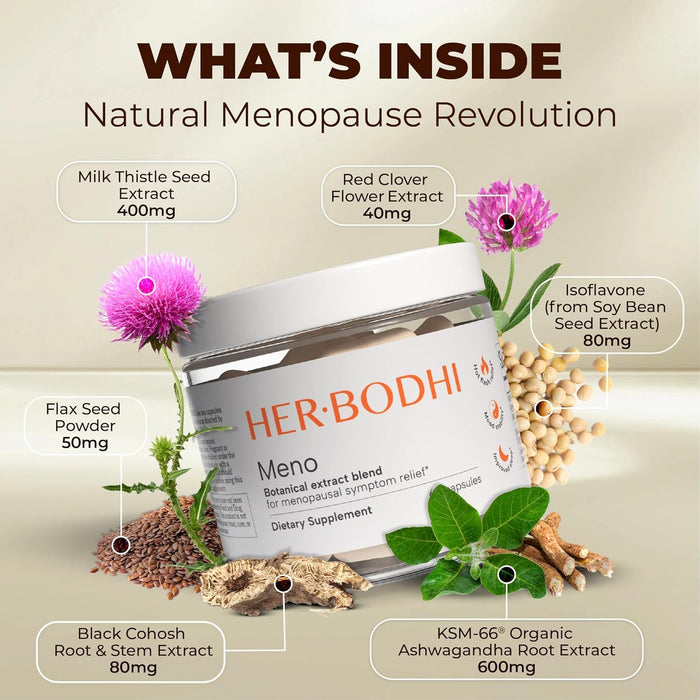 Restores natural hormonal balance—without synthetic hormones or side effects. Our formula uses clinically studied botanicals like Ashwagandha, Red Clover, and Black Cohosh to gently rebalance your body and ease menopause symptoms naturally.