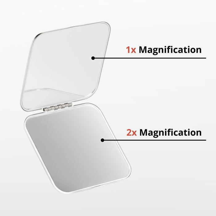 Simply open the compact and choose between the regular side for a quick check or the 2x magnifying side for precise makeup touch-ups. Perfect for use at home or on the go!