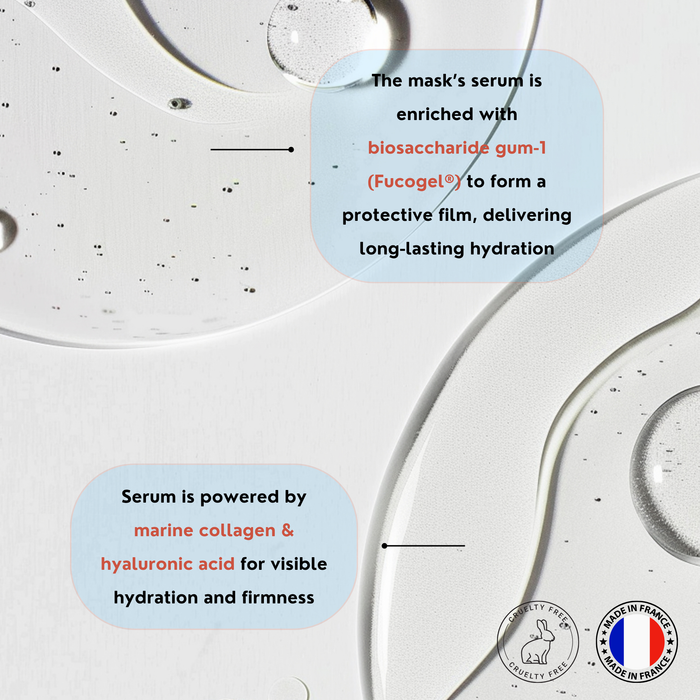 Powerful Anti-Aging Actives — Formulated with marine collagen, hyaluronic acid, and Fucogel®, it hydrates, firms, and restores radiance in just 20 minutes.