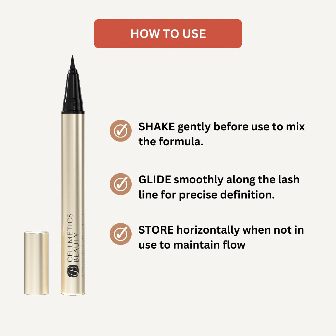 Shake gently before use. Lightly stretch outer corner of eye for smooth application. Use small, connected strokes along lash line, working outward. Paint between lashes for a seamless look. Store pen horizontally when not in use.